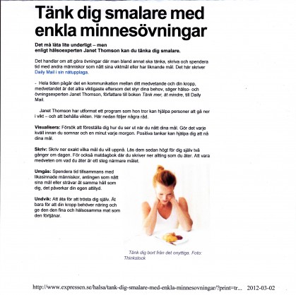 Jag blir så otroligt glad när jag läser en art. om hur man med tankens kraft kan förändra sina tankar. Som i dagens Expressen där tidningen tar upp viktminskning. Att det går,har jag bevis på.  Men man måste träna sig på avslappning.avkoppling. Hur ? Jo genom Mental träning. Jag har haft lyckan och glädjen att få både lära och utbilda mig och sedan arbeta med Mental träning fram till min pension.Att jag nu med ålderns rätt har artros lite här och där i min kropp, men ändå kan känna glädje vara positiv  och förstå min smärta, har jag den Mentala träningen att tacka för. Ni kanske hörde Stig Viklund på p4 i morse? Han slutar jobba för att bli coach för bla. Helena Ekholm och Johan Olsson. Vi har båda läst Mental träning för L-E Uneståhl vid SLH i Örebro. Den som är intresserad  får gärna gratis kopiera och lyssna till mitt avslappningsprogran här på Mommas blogg.Det är grundprogrammet till den Mentala träningen. Läs även länken: Mental träning, den är från Örebro. Jag har även givit ut en bok /Miraklet där jag berättar om min förändring.Finns att köpa på HTB förlag.