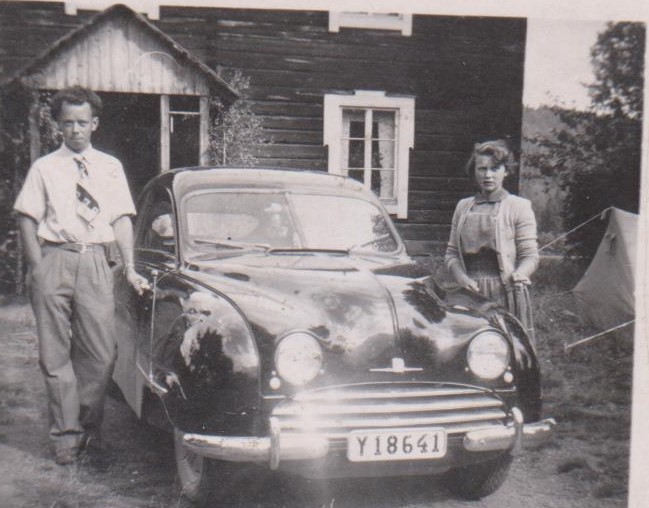 Hittade denna bild bland några gamla kort, föreställande min storebror Hans-Ingvar och mig och hans nyinköpta Saab. Hans. Ingvar var en av de första ungdomar i Bysjön som köpte sig en ny bil.Jag skulle tro att han är 21 år och jag 15. Innan dess körde han motorcykel. Tror att man för att få ta körkort på bil måste man ha fyllt 21 år. Bilden är tagen på Mjösjön framför Ville Fängströms hus. Ser ut att vara midsommar, förstukvisten är prydd med björkar. Och vi är finklädda. Undra om inte Hans – Ingvar skulle hälsa på Karl Axel Fängström som då också bodde där. Jag har inget minne av just den dagen, men jag minns att jag ofta fick åka med honom. Bl. a. på logdanser, det var så kjell och jag träffades, just på Mjösjön. 1953.