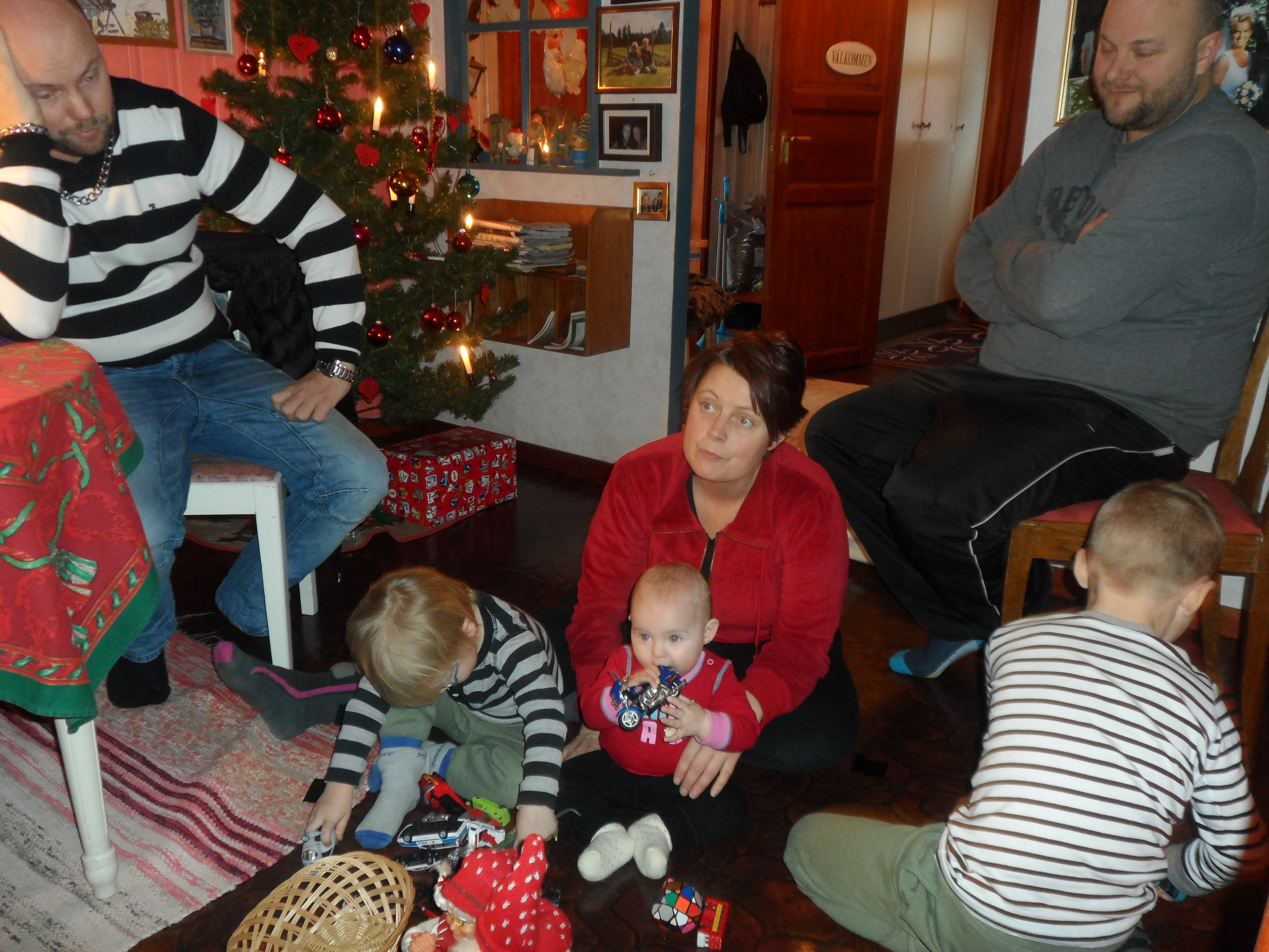 Juldagen blev som julafton brukar vara. Rörig ,stökig , rolig, unga och gamla samlas. Det var tjo.tjim skratt och glam , en liten tår ibland, men mycket glädje trängdes från golv till tak. Barnbarn som var små för 30 år sedan ,är vuxna nu med egna barn, det behövs mera plats. men traditioner ska följas. Kjell och jag har blivit åskådare, placerar oss lite vid sidan om, allt flyter på som det brukar. När det är dags att äta så är det dukat som det alltid varit förr om åren. En liten Tomtenisse kom sedan med julklappar till alla, även till ”lodejös”! Men något kort blev inte tagit i går.