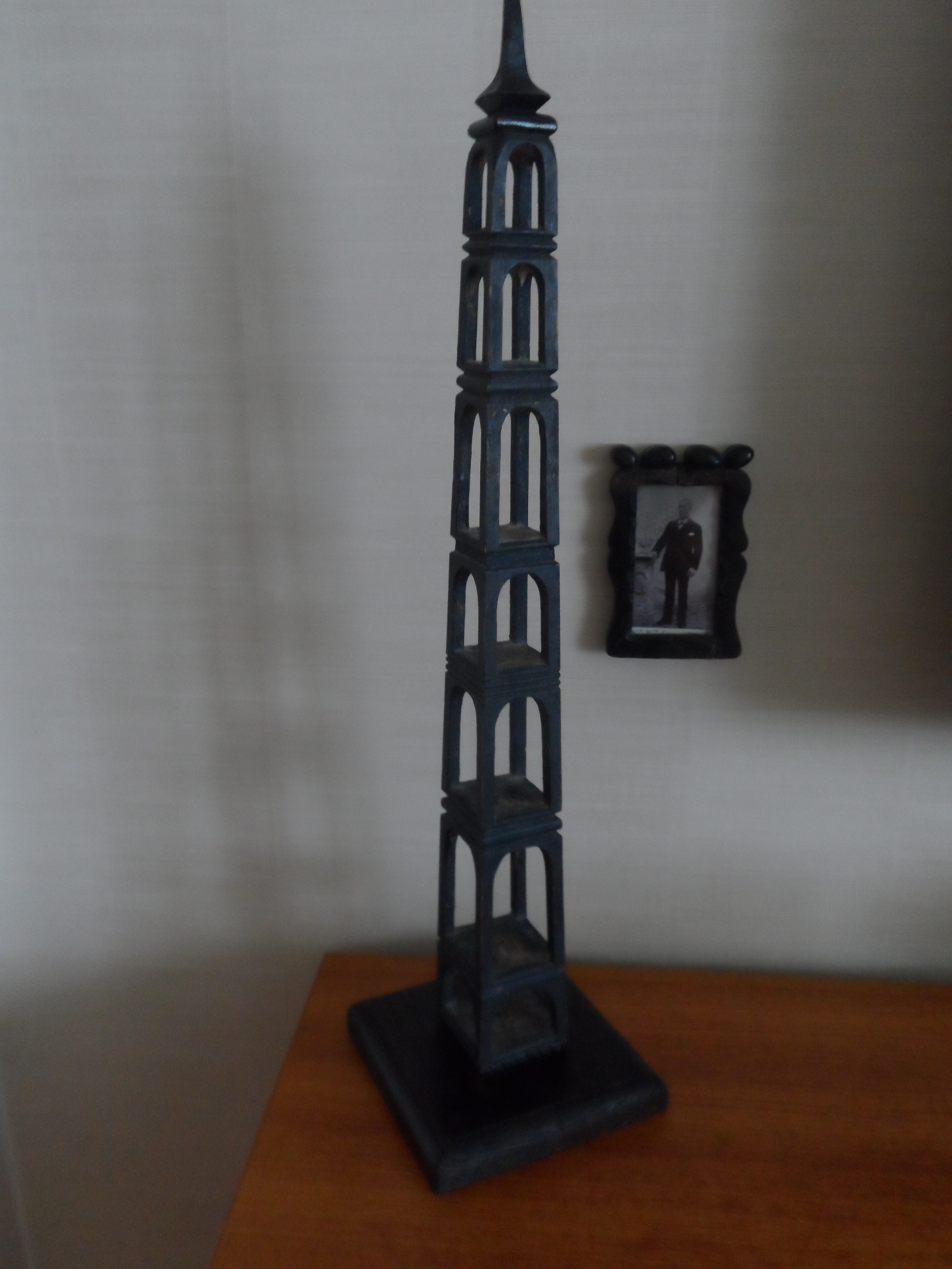 det, ur ett helt trästycke.. Kjells mamma kallade det för ”linsmycke”. , till spinnrocken. Hon berättade också att han arbetade en vinter i timmerskogen, bodde i en skogskoja. Hela vintern snidade han på det som en fästmögåva till Kjells mormor Märta. Det är också Morfar August Sundvall på kortet. Ramen har han tillverkat själv. Nu pryder det sin plats hos oss.